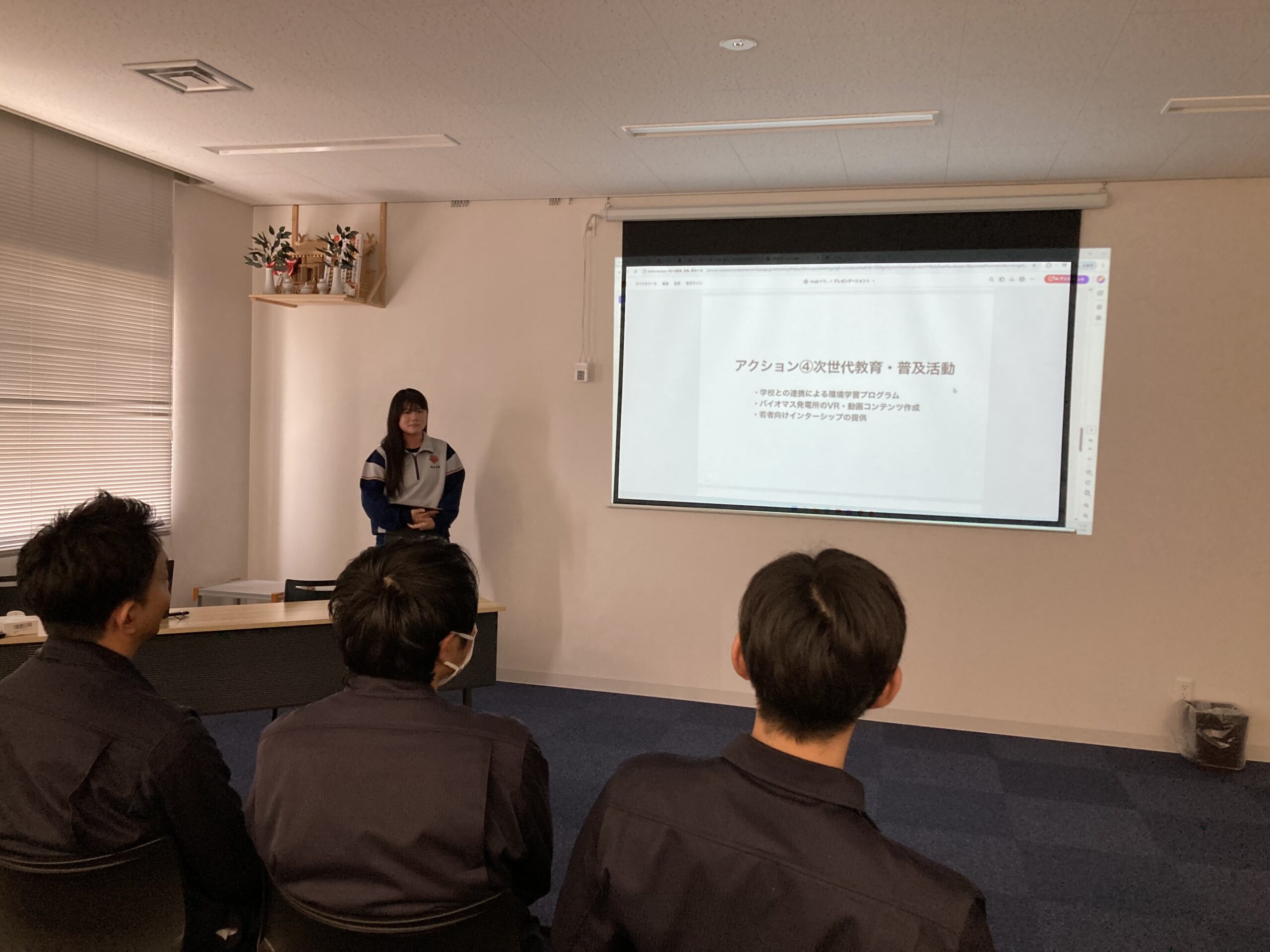 12月3日、5日に石巻西高校1学年の生徒お二人が、「街ミッション」(地域課題探求フィールドワーク)で当社来訪され、「ゼロカーボンシティを地域に浸透させる為に当社が取るべきアクションは何か」というテーマでプレゼンテーションを実施してくれました。