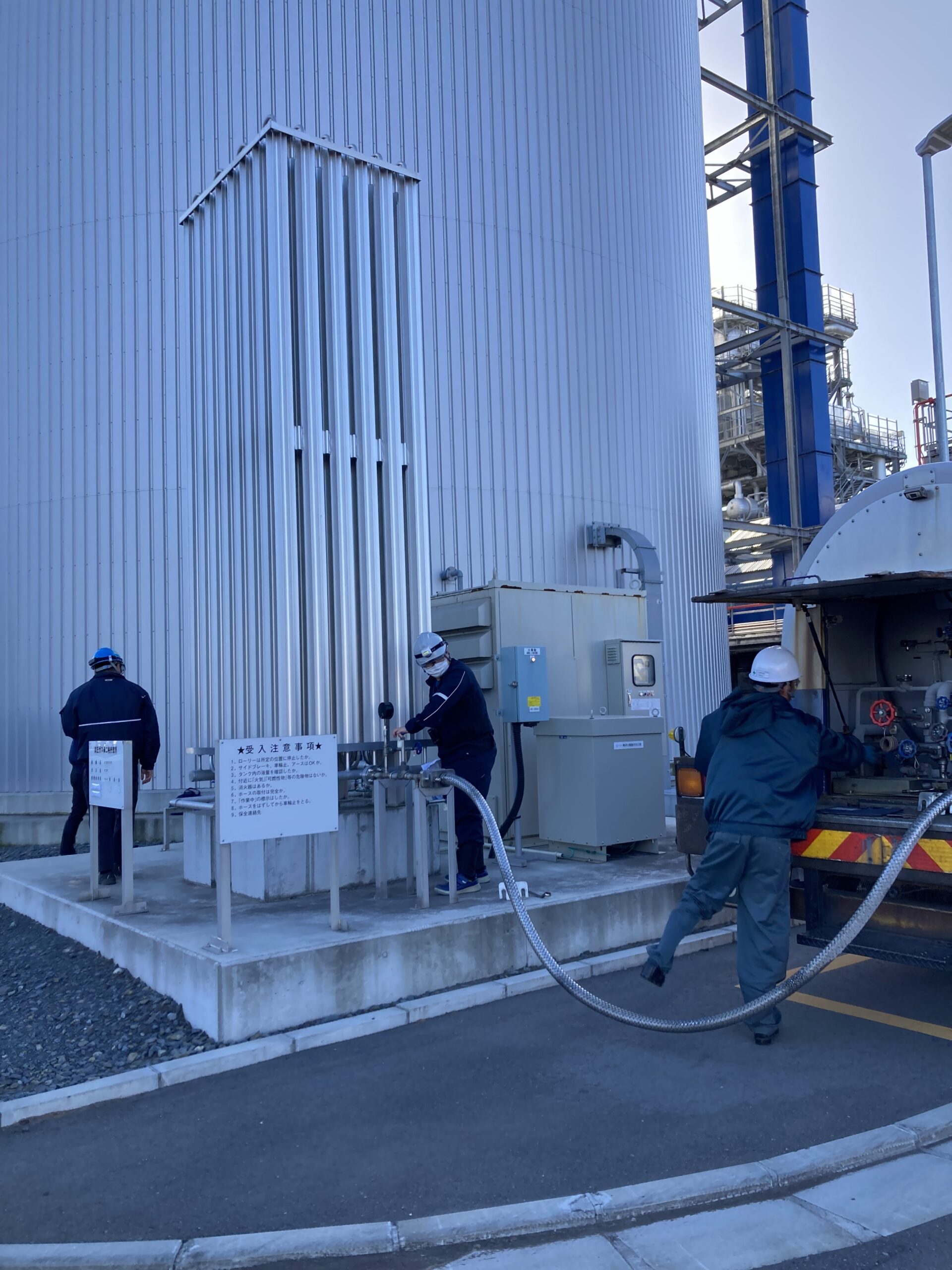 11月11日に発電所年次防火訓練を実施し、木質ペレット燃料タンク内での高温・二酸化炭素濃度上昇を想定し、窒素封入設備及び液化窒素ローリーによるタンク内窒素封入を再現しました。